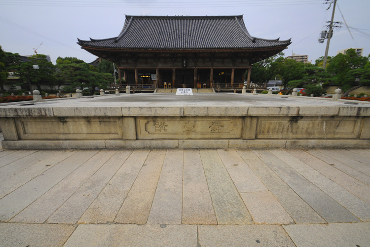 正式には、六時礼讃堂で昼夜六回にわたって礼讃を行う事から六時礼讃堂と呼ばれています。石舞台は、毎年4月22日に聖徳太子を偲んで行われる大法要の時に舞楽で使われる舞台で、日本三舞台(厳島神社の高舞台・住吉大社の石舞台・四天王寺の石舞台)の一つです。正面・下に書いてある「舞台講」とはこの舞台再建に寄進の労をとった大阪の材木問屋の集まり(講)の名称です。